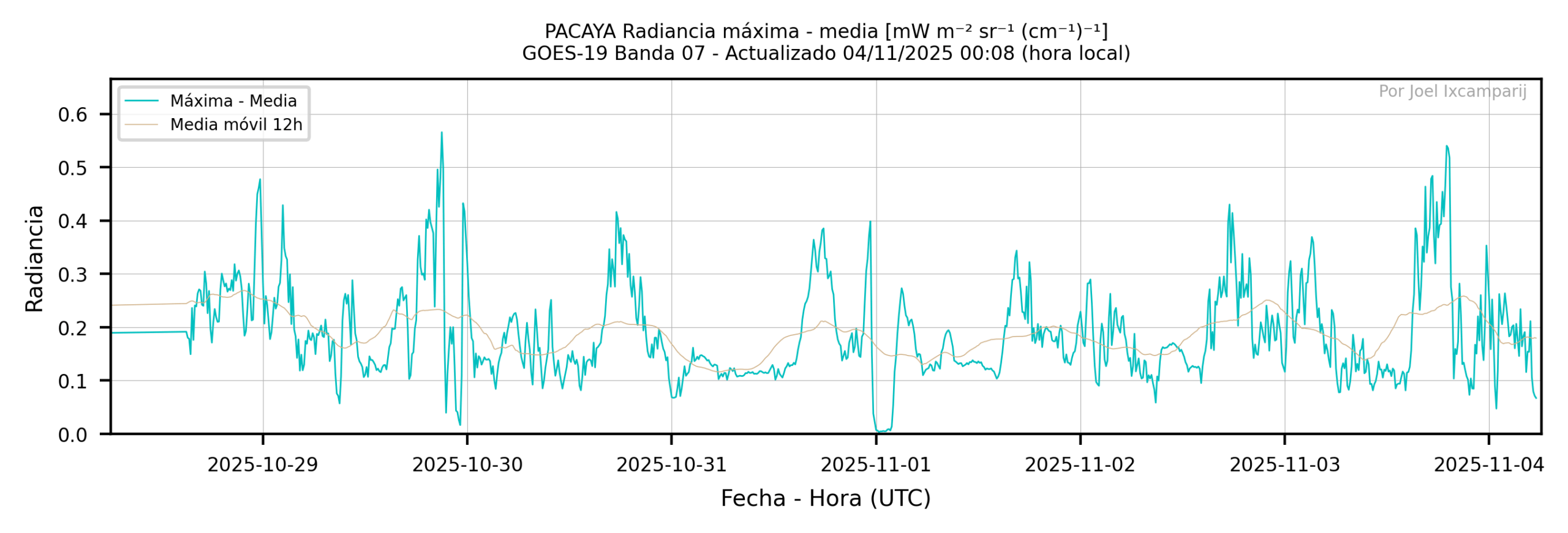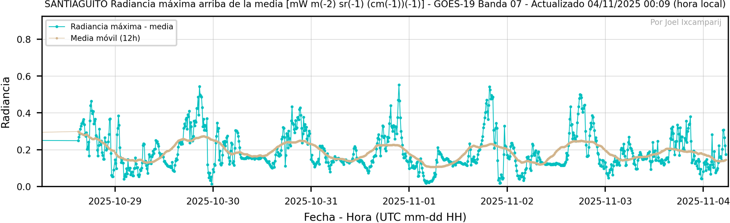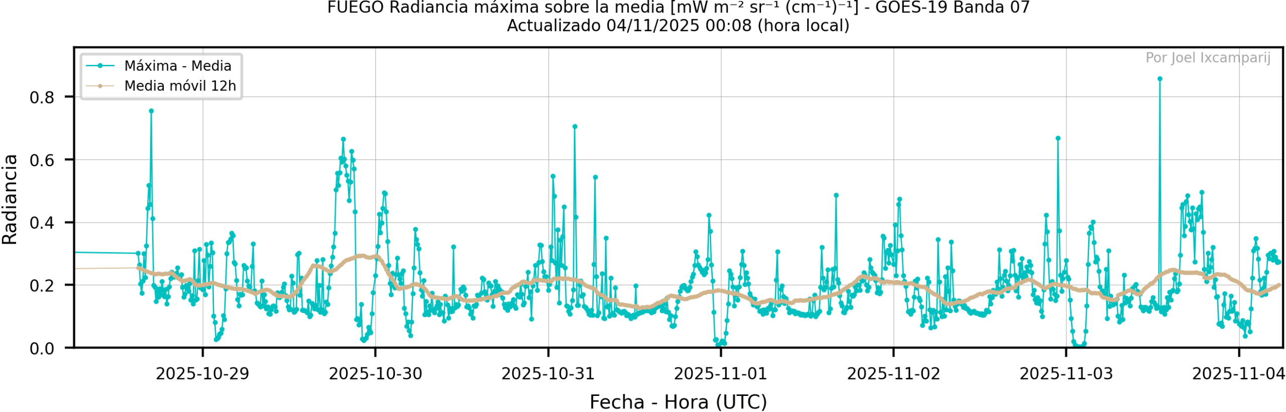 Los siguientes tres gráficos presentan la radiancia máxima emitida por la región monitoreada menos la radiancia media de la zona. Esto permite disminuir el efecto de la reflexión de luz solar el cual tiene un ciclo diurno. Cubre los últimos 7 días y tiene una resolución temporal entre 10 y 15 minutos.
