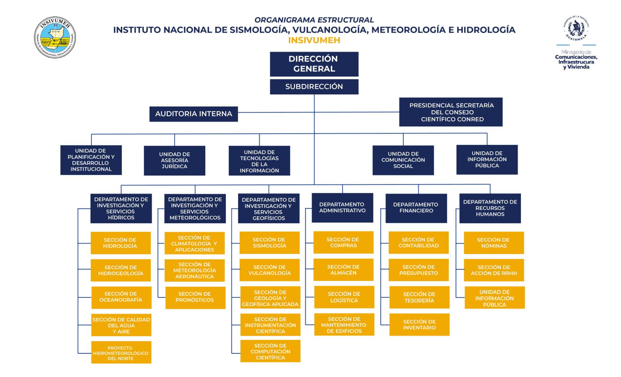 El Instituto Nacional de Sismología, Vulcanología, Meteorología e Hidrología (INSIVUMEH) cuenta con una estructura organizativa diseñada para garantizar la eficiencia, transparencia y profesionalismo en el cumplimiento de sus funciones. Cada unidad, departamento y sección desempeña un papel fundamental en la gestión técnica y científica del país, promoviendo la investigación, el monitoreo y la prestación de servicios especializados en sus distintas áreas. La institución valora profundamente la experiencia, la preparación académica y la meritocracia, reconociendo que el desarrollo institucional se fortalece a través del compromiso y la excelencia profesional de su personal.
